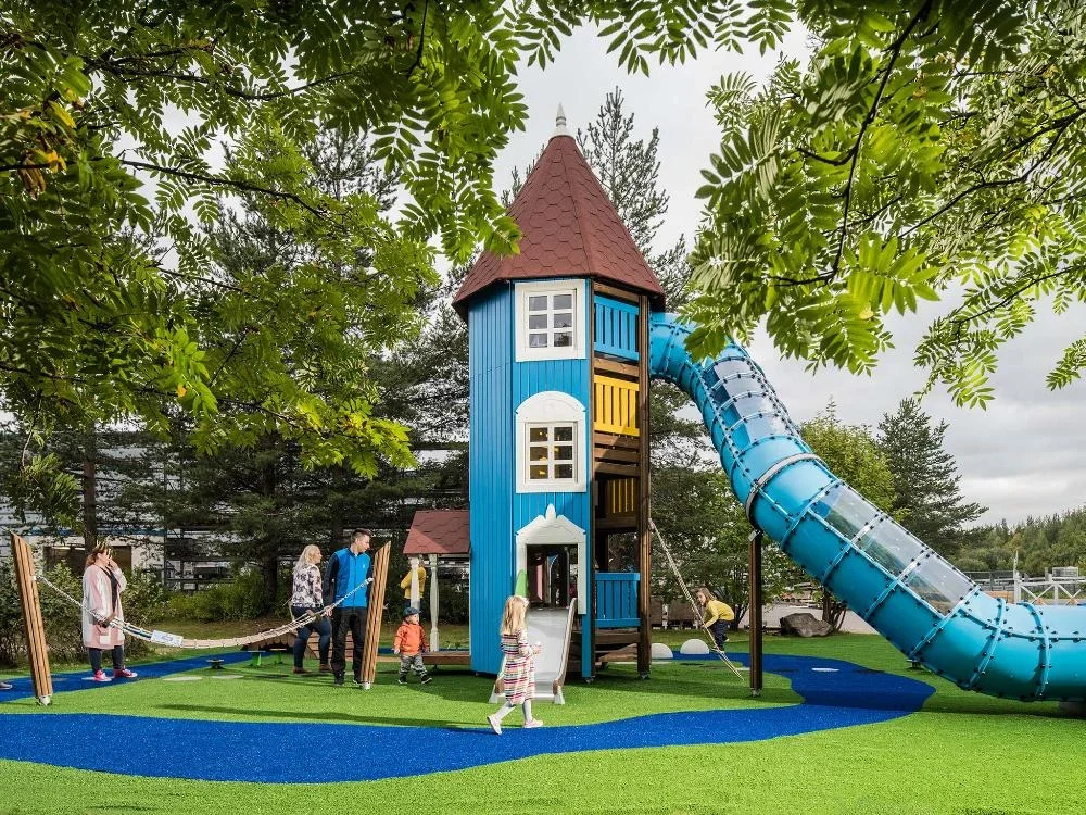 האטרקציה הבולטת של מתקני משחק בפארק המומינים הוא הבית הכחול. זהו ביתם עגול של המומינים עם גג מחודד שנבנה לפי האיורים של הסופרת. מהבית שאליו מטפסים בסולמות פנימיים ומגיעים לגבהים מרתקים אפשר לצאת לכל מיני פתחים של הפתעות כמו גשרים המובילים לבתים אחרים ומגלשות מסתלסלות שחלקן קצרות וחלקן ארוכות, חלקן פתוחות וחלקן סגורות, כמו צינור ארוך היוצר תהודה נפלאה לשמע צהלות השמחה של הילדים בגלישתם מגבהים שנדרש בהם אומץ.