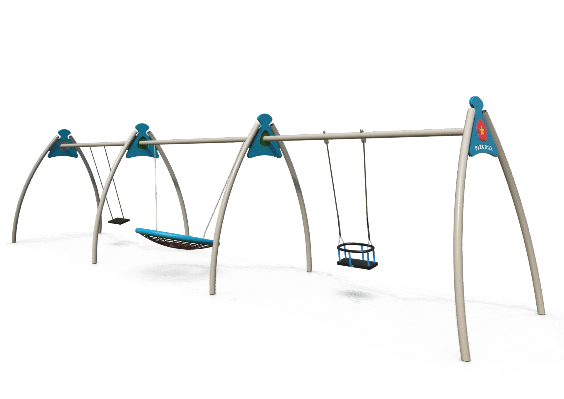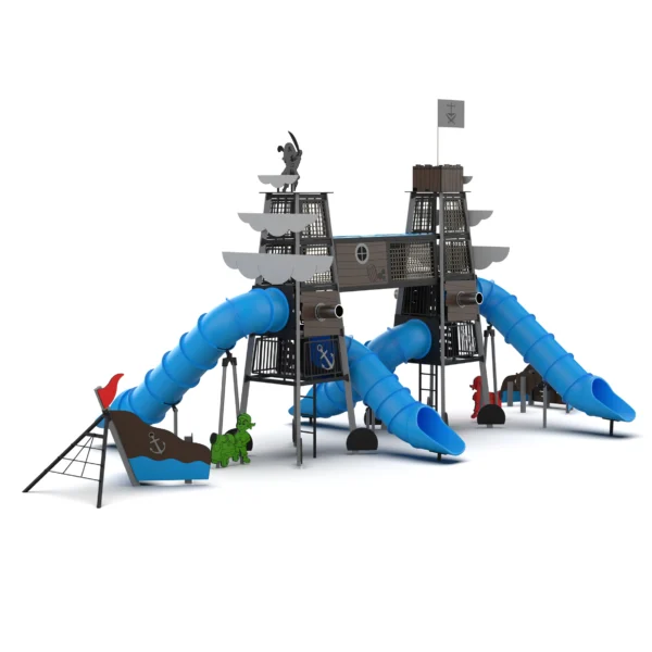 11 עמודי אלומיניום, משטחי HDPE ממוחזר נגד החלקה, מעקות מתכת פתוחים, פאנלים ומגלשות PTE רוטומולדיות, גשר ועוד