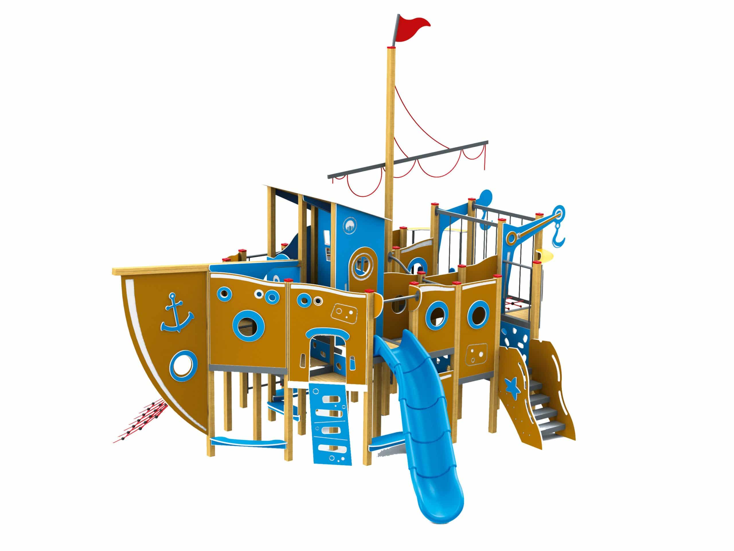 עמודי עץ חום כהה, פאנלי HPL ירוקים ומגלשה מתכת