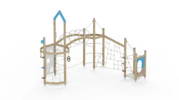 מתקן משחקים בדמות ציפור כחולה שמביאה את האביב, עם מגוון מוקדי פעילות למשחק חברתי ותנועתי.